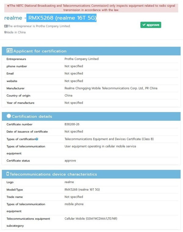 外媒表示,2026年3月,就有消息称有真我16T这款机型,其型号为RMX5268。同月,该机出现在印度BIS认证平台的数据库中,如今又获得了泰国NBTC认证。真我16T预计提供三个存储版本:6GB+128GB、8GB+128GB、8GB+256GB,以及星光红、星光黑、极光绿等配色。
